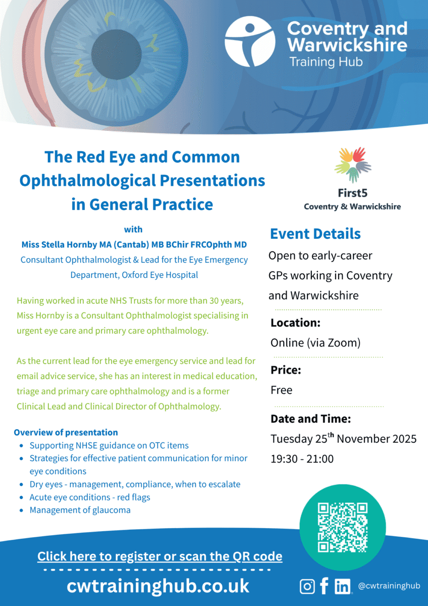 I have a passion for teaching and education and in my role of First 5 (C&W) Ambassador, I hope to provide specifically tailored teaching opportunities and networking events for GPs during their first 5 years after qualification. These sessions will be a space for for First 5 GPs working in Coventry and Warwickshire to network, share thoughts and discuss challenges.