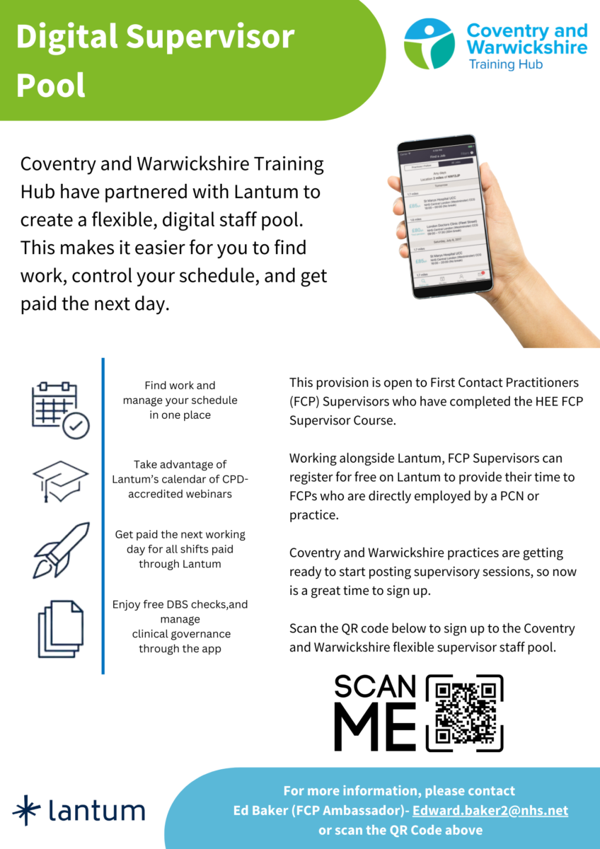 Coventry and Warwickshire Training Hub have partnered with Lantum to create a flexible, digital staff pool. This makes it easier for you to find work, control your schedule, and get paid the next day.