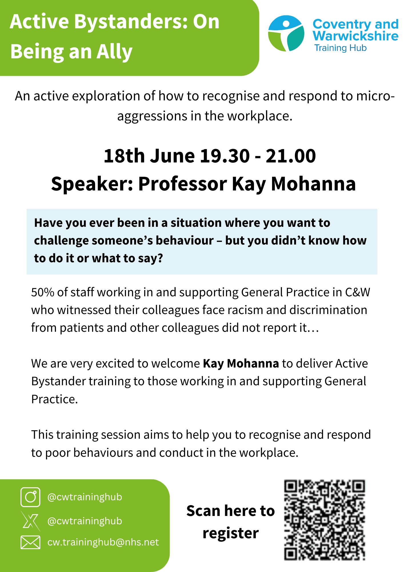 This training session will give you the tools you need to be able to recognise and respond to micro-aggressions in the workplace – see poster below for more details and QR code to register.