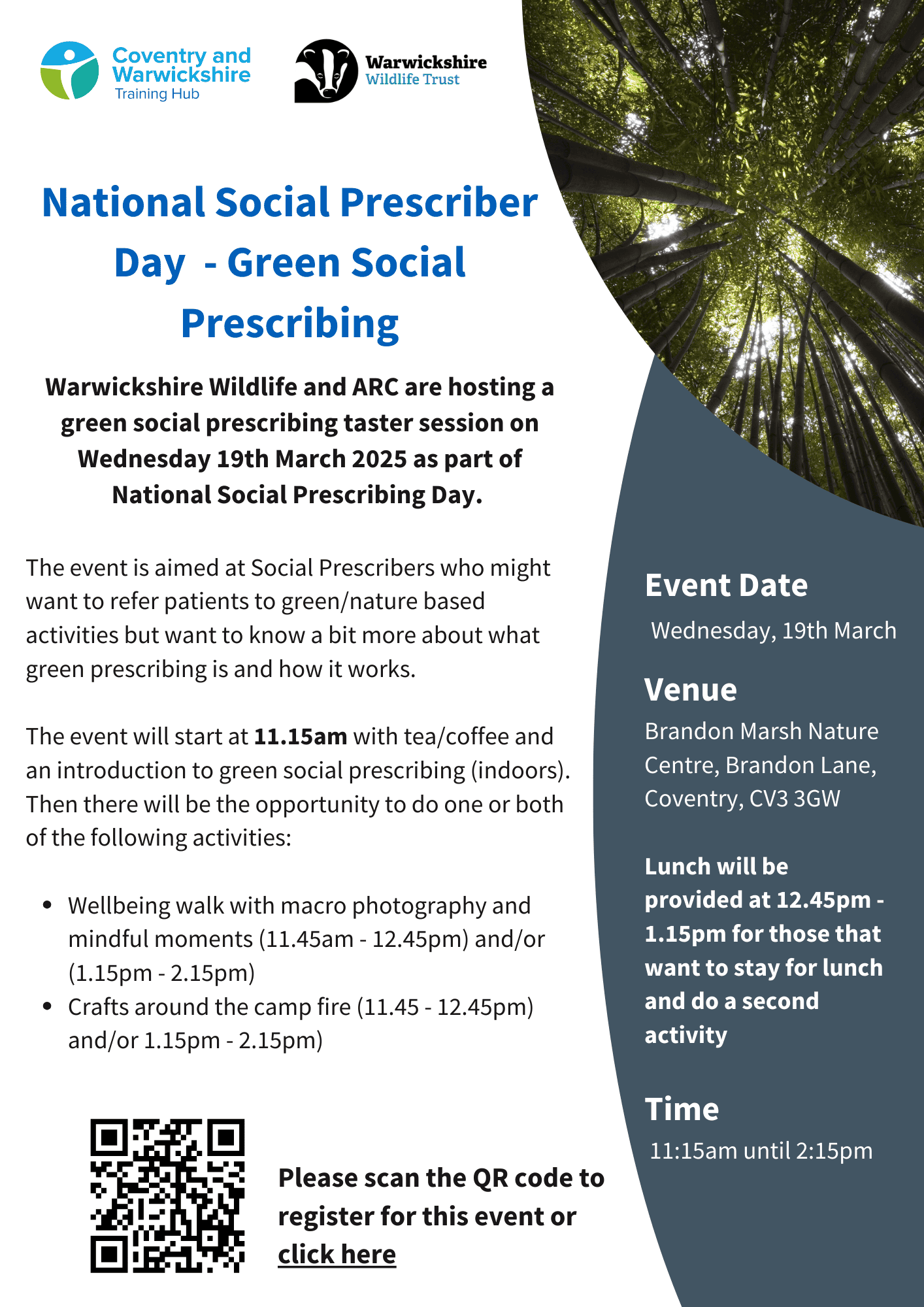 Working with Warwickshire Wildlife and ARC, we are hosting a green social prescribing taster session on the 19th March at Brandon Marsh. For more details, please click here. This event will include a wellbeing walk with mindful moments and macro photography and crafts around the camp fire.