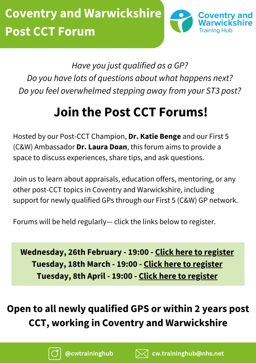 Join us to learn about appraisals, education offers, mentoring, or any other post-CCT topics in Coventry and Warwickshire, including support for newly qualified GPs through our First 5 (C&W) GP network.