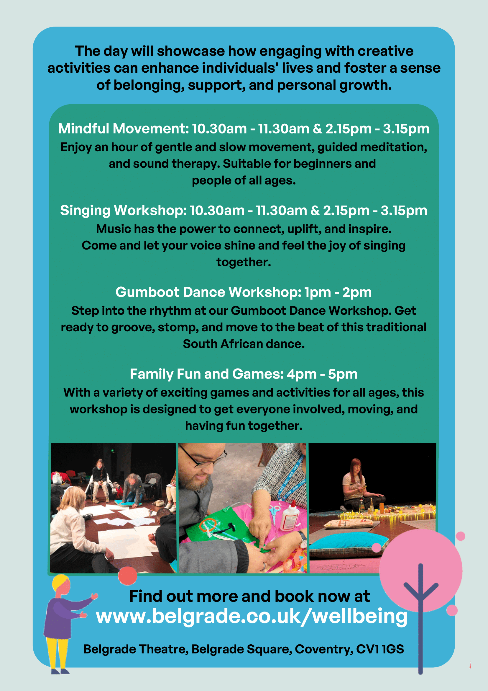 The Belgrade Theatre is also hosting a Creative Wellbeing day event on the 19th March, including activities such as choir singing, Death café conversations, all day sensory arts and crafts and more. For more details, please click here.