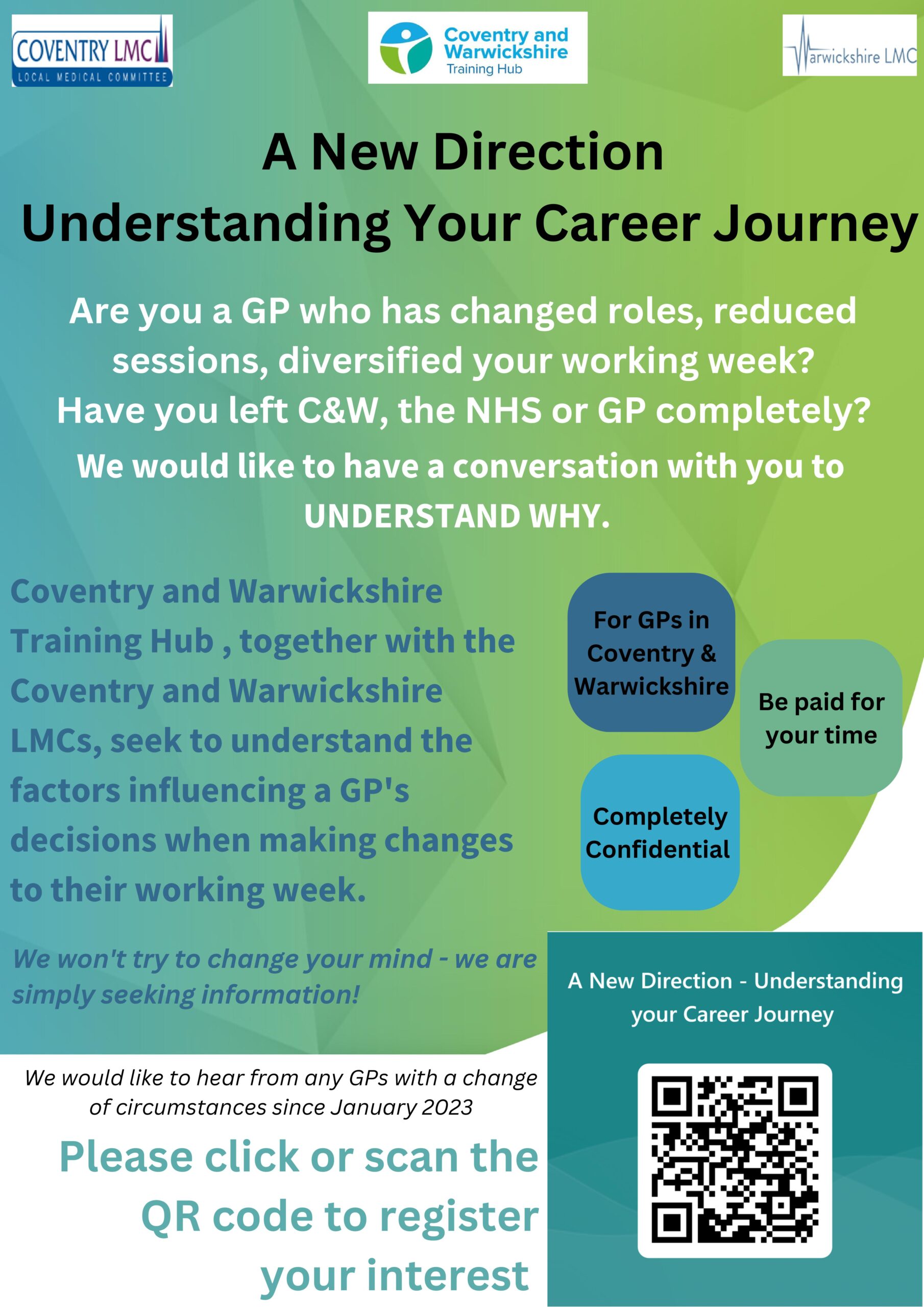 Are you a GP who has changed roles, reduced sessions, or diversified your working week? Have you left C&W, the NHS, or General Practice completely? If so, we would like to have a conversation with you to understand why.