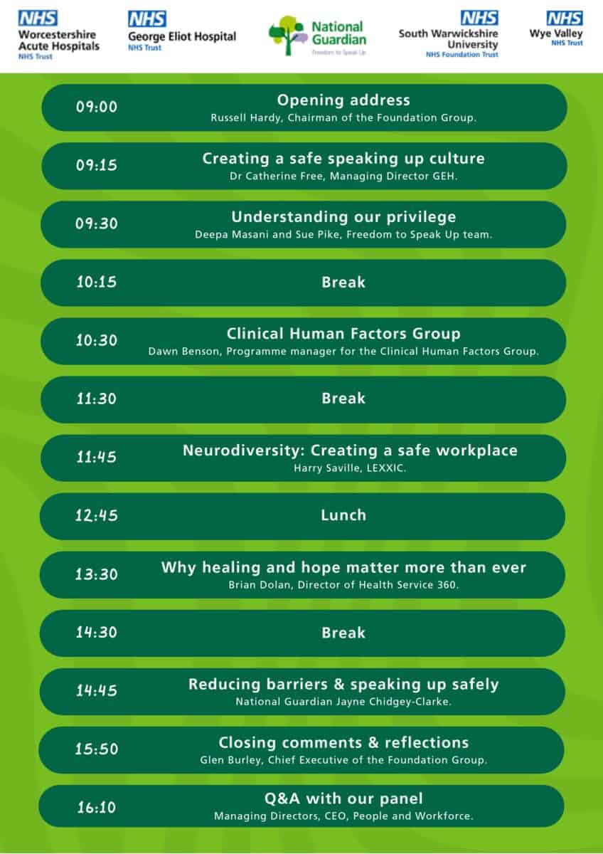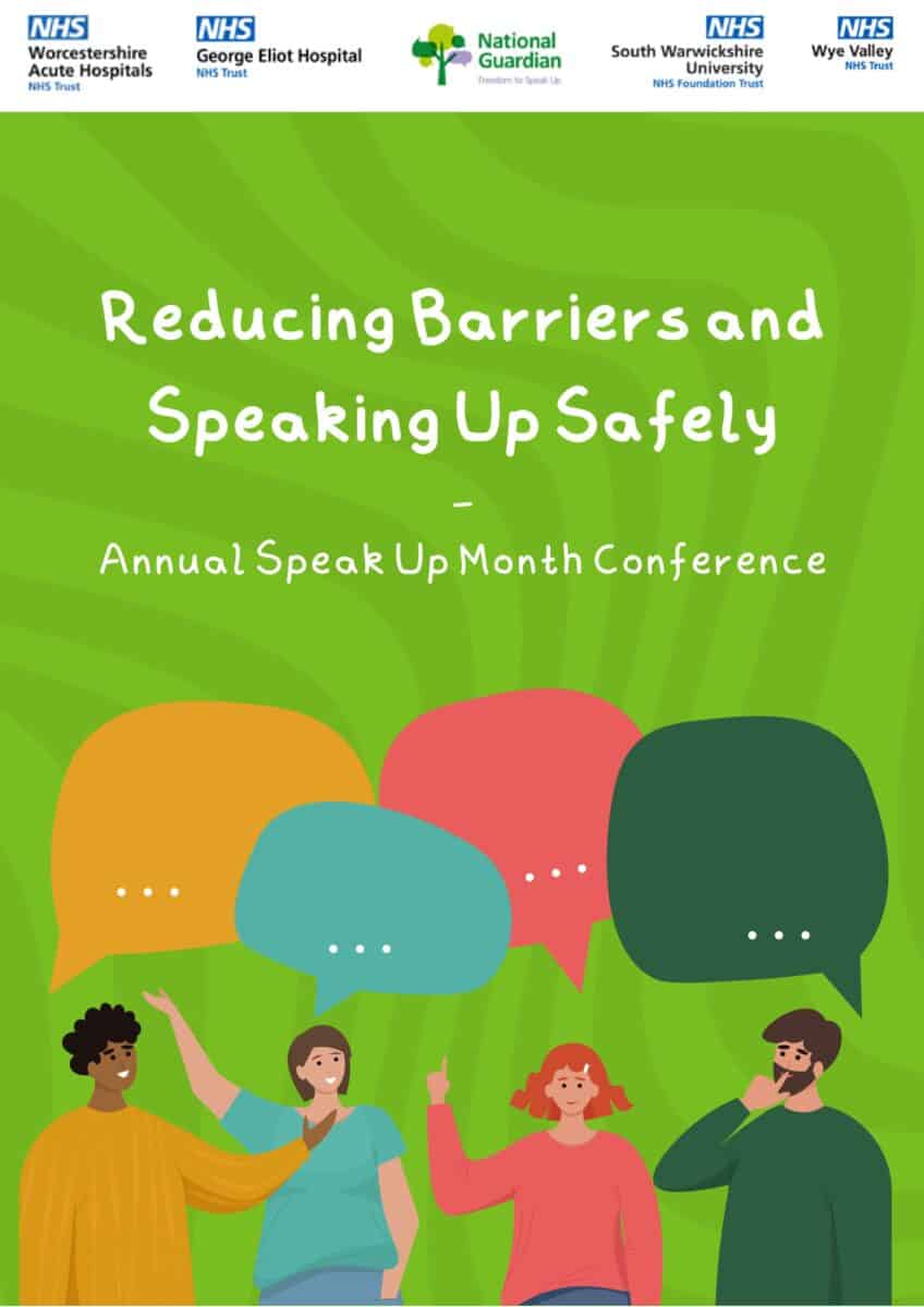 SWFT and GEH Trusts are hosting this conference on ‘Reducing Barriers and Speaking Up Safely’ on the 10th of October. You are able to join a session that is of interest to you, or the whole day. This conference is open to champions/ambassadors and others who have an interest in speaking up.