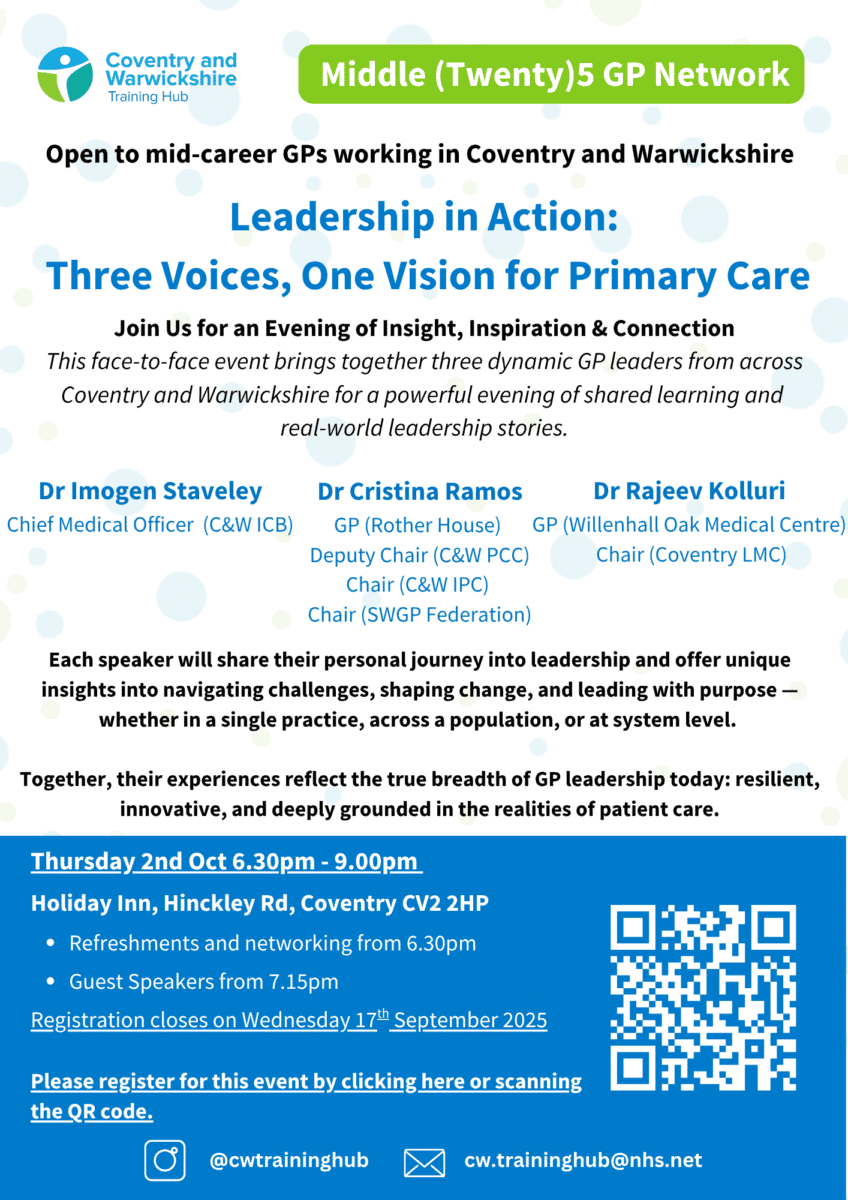 Join us for an evening of Insight, Inspiration and Connection. This face to face event brings together three dynamic GP leaders from across Coventry and Warwickshire for. Powerful evening of shared learning and real world leadership stories.