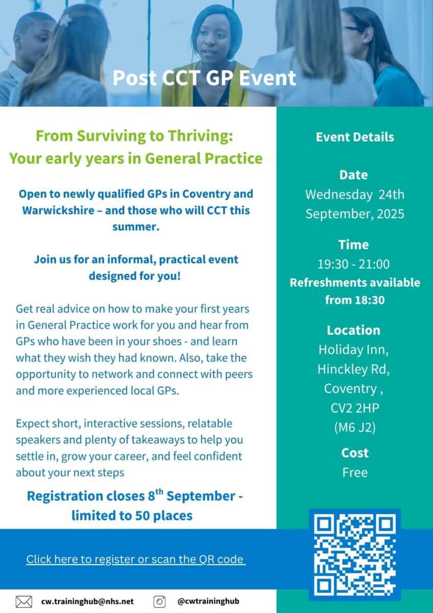 Open to newly qualified GPs in Coventry and Warwickshire – and those who will CCT this summer.