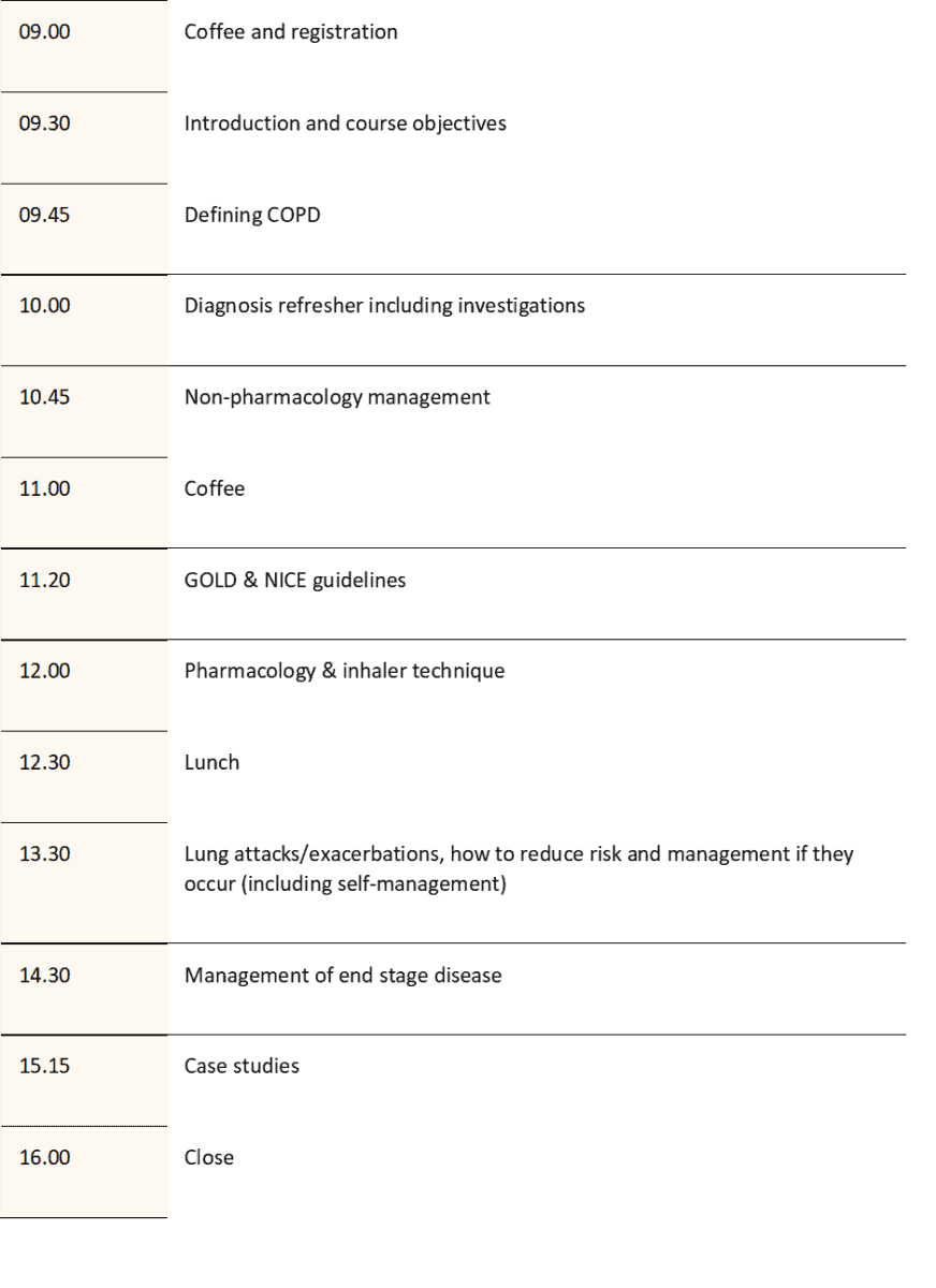 Understanding the complexities and care requirements of end-stage COPD will also be a key aspect of this course. The day will conclude with interactive case studies, allowing you to apply your refreshed knowledge in real-world scenarios, encouraging the sharing of experiences and best practices among your peers.