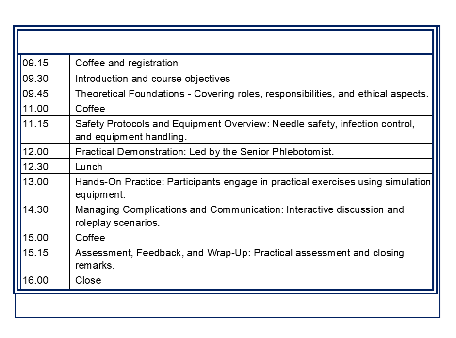 This engaging day-long program promises not only a thorough grounding in the theoretical aspects of phlebotomy but also provides ample opportunity for practical, hands-on learning.