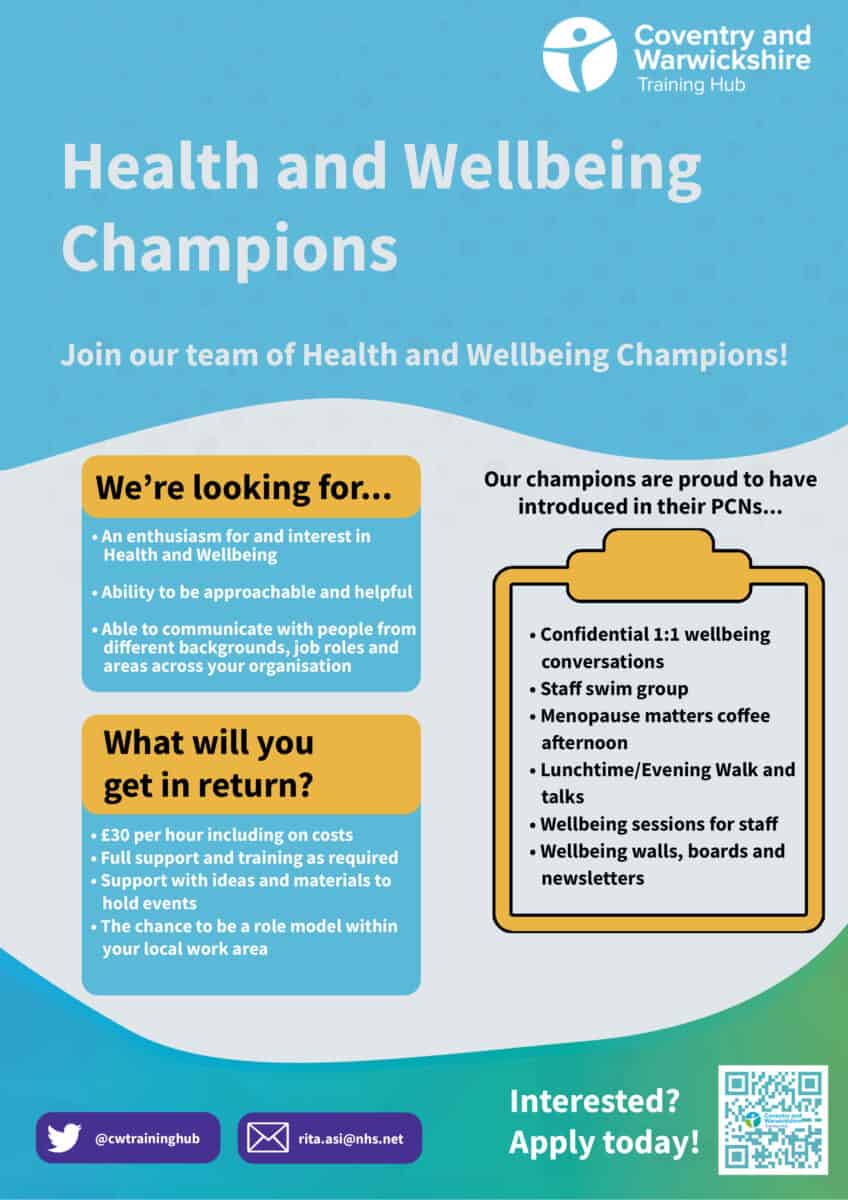 Feel free to share this poster with your colleagues who are passionate about HWB and for further information on the role, please contact Rita Asi via rita.asi@nhs.net