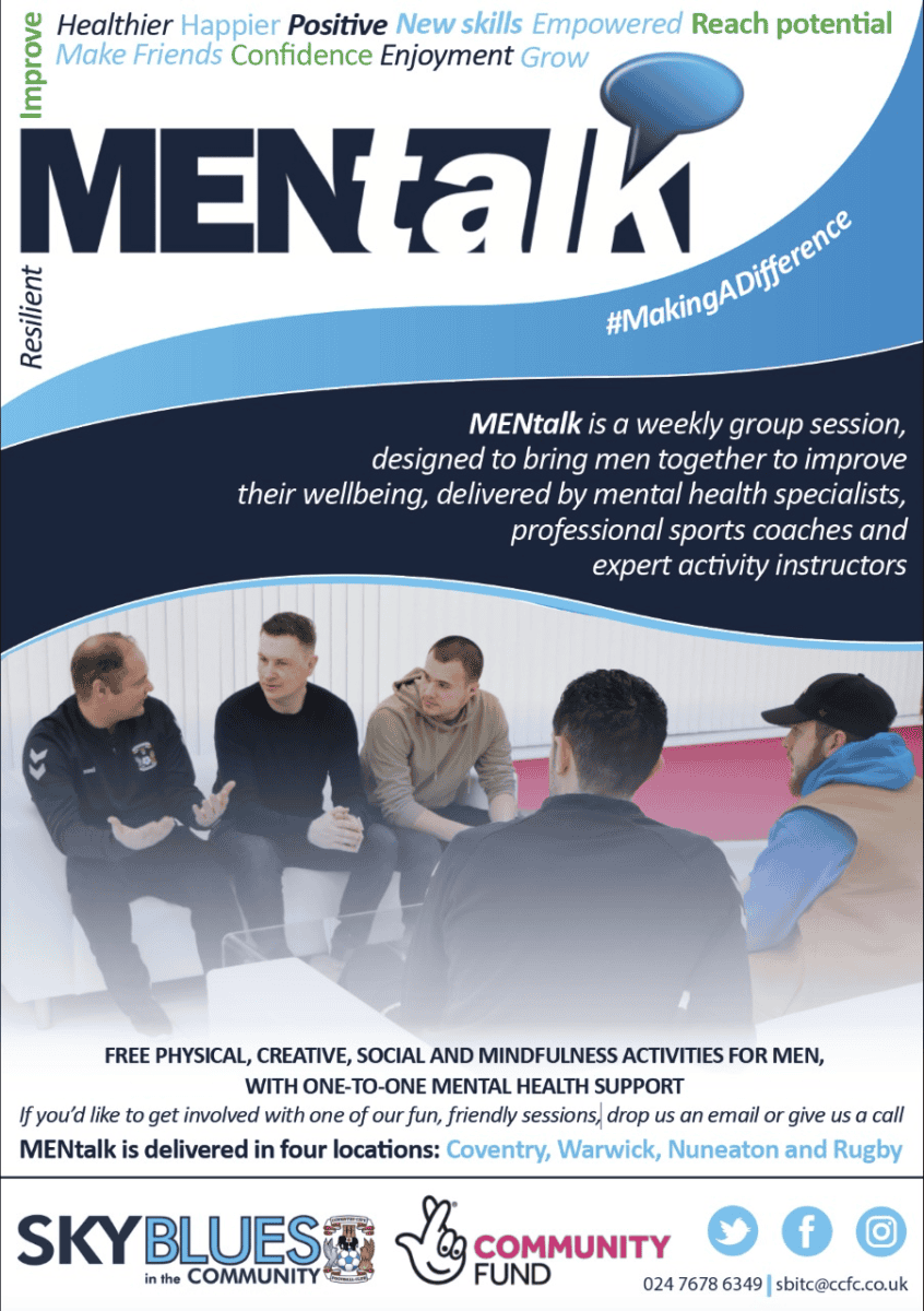 MENtalk is a weekly group session designed to bring men together to improve their wellbeing, delivered by mental health specialists , professional sports coaches, and expert activity instructors.