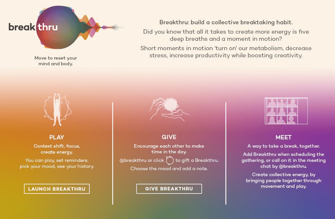 Breakthru is a new wellbeing application in Teams offering tiny breaks, to share and play, free for all NHS colleagues to improve their wellbeing.