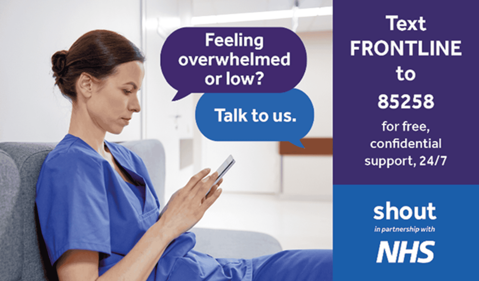 The Shout text service is a national staff support service for all our staff which provides immediate help and signposts to health and wellbeing support.